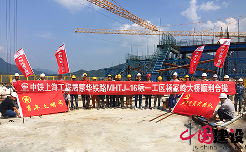 9月7日,經(jīng)參建人員近5小時的連續(xù)奮戰(zhàn),由中鐵上海局蒙華鐵路MHTJ-16標(biāo)段一工區(qū)承建的楊家?guī)X大橋中跨合龍段混凝土順利澆筑完成,標(biāo)志著蒙華鐵路晉豫管段唯一左右分幅、斜跨三淅高速公路、采用菱形掛籃懸臂灌注法施工、最大跨度連續(xù)梁大橋——楊家?guī)X大橋順利合龍。