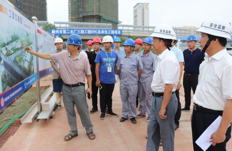 9月9日下午,贛州經(jīng)濟(jì)技術(shù)開發(fā)區(qū)管委會(huì)主任陳水連到公司承建的贛州第二水廠三期工程項(xiàng)目檢查指導(dǎo)工作,贛州經(jīng)開區(qū)住建局局長翁毅軍、水務(wù)集團(tuán)副總經(jīng)理陳俊陪同。陳水連深入施工現(xiàn)場(chǎng),聽取了項(xiàng)目工程概況、施工推進(jìn)情況以及安全質(zhì)量管控等詳細(xì)匯報(bào),重點(diǎn)查看了水廠的整體布局,以及水廠與客家大道交叉段控制性結(jié)構(gòu)聯(lián)絡(luò)通道的施工進(jìn)度。陳水連強(qiáng)調(diào)安全責(zé)任大于天,在施工過程中,項(xiàng)目部要嚴(yán)格落實(shí)安全管控措施,確保施工安全,樹立良好的央企形象。同時(shí)要做到科學(xué)組織、務(wù)實(shí)求精、達(dá)標(biāo)創(chuàng)優(yōu),確保水廠建設(shè)按期完成。