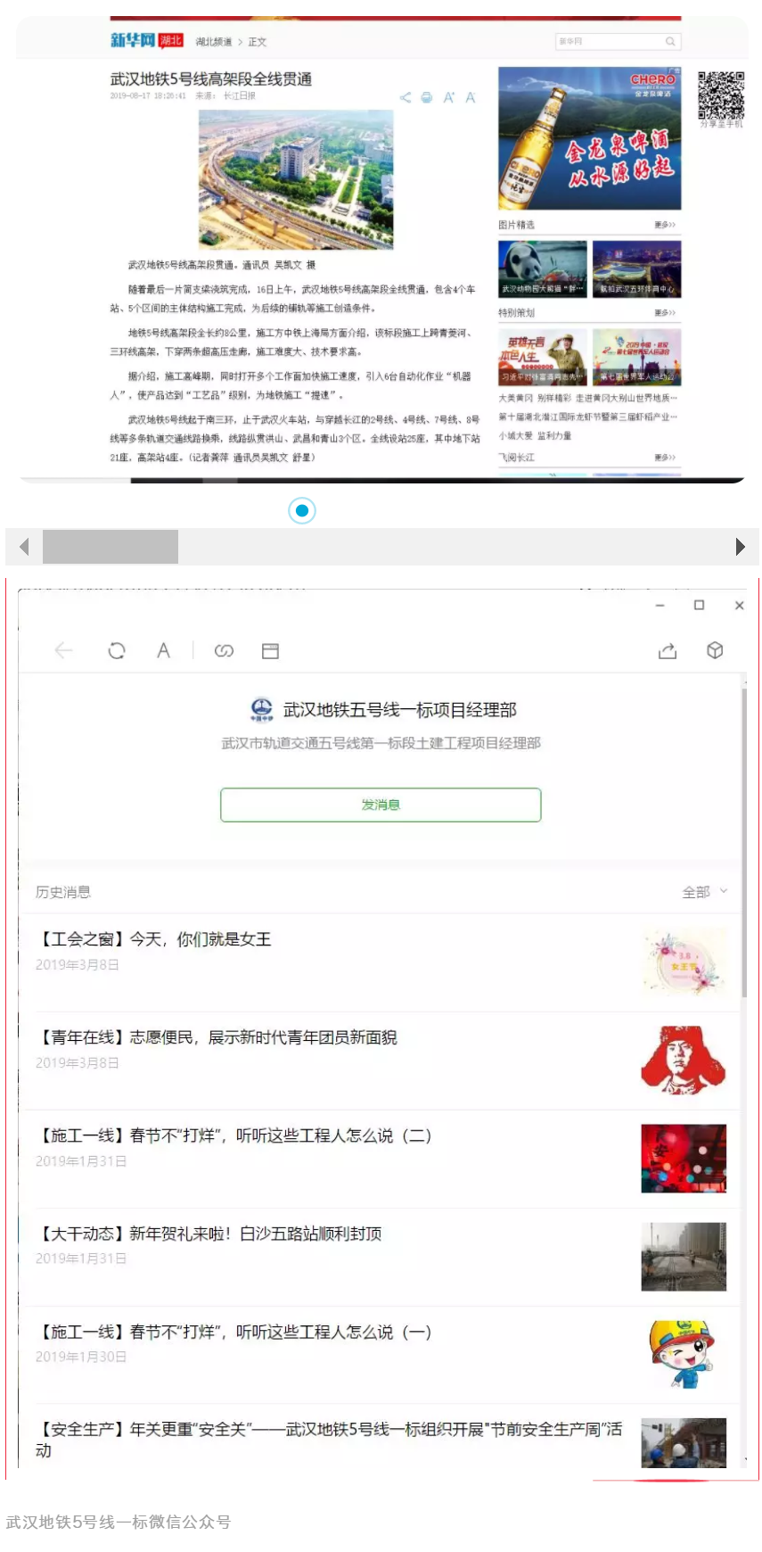 武漢地鐵5號線一標項目黨支部成立了由項目書記為組長的宣傳工作領導小組,組織制定了項目宣傳工作年度計劃及獎懲辦法。在《中鐵上海工程》報投稿工作方面,每月制定宣傳工作總結和下月工作計劃,截至目前已在《中鐵上海工程》報上刊稿6篇。在對外宣傳工作方面,在重大節(jié)點、人才培養(yǎng)、企業(yè)文化等方面深入挖掘,此外,黨支部還創(chuàng)辦了“武漢地鐵五號線一標項目經理部”微信公眾訂閱號,每日上傳施工日報,并結合施工生產、黨建工作及企業(yè)文化等方面情況,開辟了大干動態(tài)、黨群園地、信息速遞等欄目,第一時間推送微信信息,將微信公眾號打造成了展示項目文化的“窗口”。