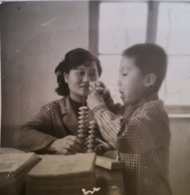 在這張泛黃的老舊照片上,老師孫毅眼神充滿關(guān)懷,手把手地教導(dǎo)著一年級(jí)的孔慶偉擺弄教具上的珠子。小朋友神情專注,微微張開(kāi)的嘴巴似乎急切著想解開(kāi)教具上謎題。