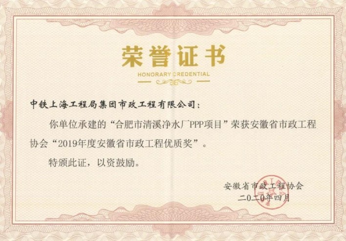 近日,安徽省市政協(xié)會(huì)傳來喜訊,公司承建的合肥市清溪凈水廠PPP項(xiàng)目榮獲安徽省“市政工程優(yōu)質(zhì)獎(jiǎng)”。