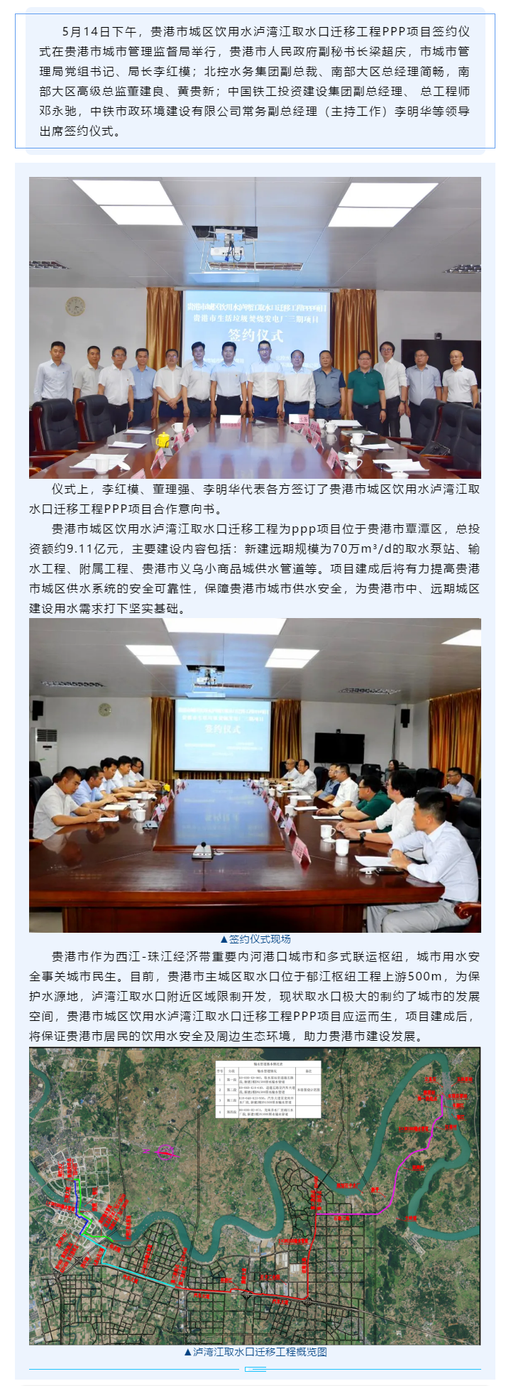 中鐵市政環(huán)境簽約貴港市城區(qū)飲用水瀘灣江取水口遷移工程PPP項(xiàng)目
