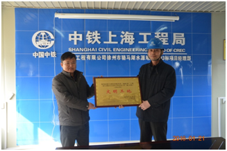 1月21日,徐州市水利局規(guī)計(jì)處處長(zhǎng)于孝民為公司徐州駱馬湖水源地施工03標(biāo)項(xiàng)目部頒發(fā)“文明工地”證書,并舉行授牌儀式。