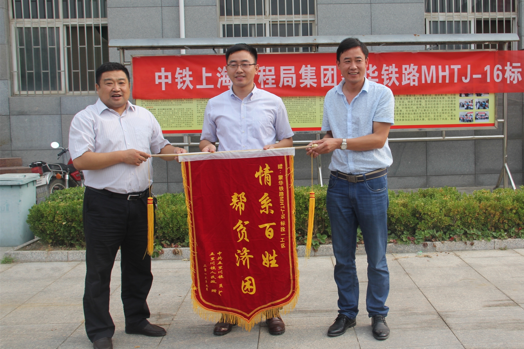 9月18日,來自河南省盧氏縣五里川鎮(zhèn)19個(gè)貧困村的143個(gè)貧困戶齊聚鎮(zhèn)政府,領(lǐng)取了由蒙華鐵路16標(biāo)一工區(qū)援助的5000只脫貧致富雞苗。該工區(qū)項(xiàng)目黨支部積極參與地方“精準(zhǔn)扶貧”,彰顯央企社會(huì)責(zé)任,與當(dāng)?shù)劓?zhèn)黨委、政府建立了良好的溝通交流機(jī)制,同時(shí)與當(dāng)?shù)卮迕窠⒘撕椭C、穩(wěn)定的良好關(guān)系。圖為縣政府代表和鎮(zhèn)黨委書記為一工區(qū)獻(xiàn)錦旗。
