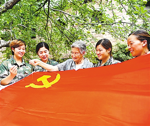 6月30日,中國歷史文化名村河北省沙河市王硇村開展“同心共筑中國夢 紅色基因永傳承”主題活動,一位60年黨齡的老黨員帶領(lǐng)女子民兵班的民兵,一針一線將中國共產(chǎn)黨黨徽繡在鮮艷的紅旗上,以表達對黨的無限熱愛、對祖國的美好祝福。趙永輝攝
